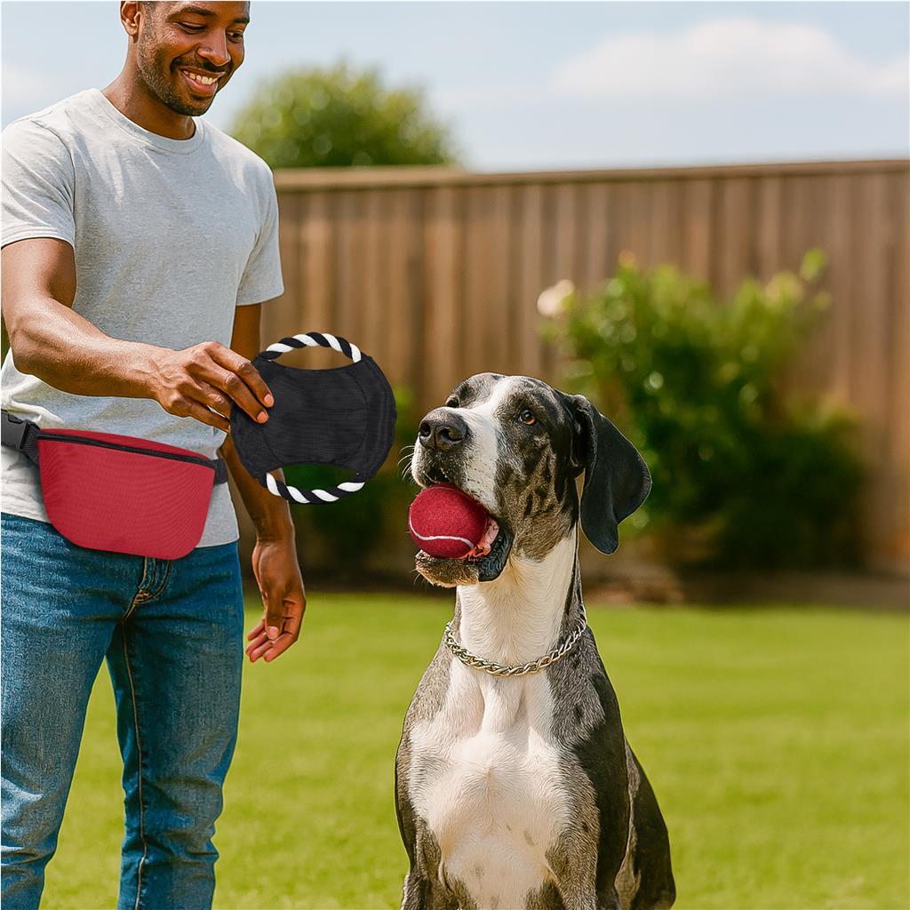 Stay hands-free and fully equipped for playtime with this all-in-one pet adventure set. The crossbody bag comes pre-packed with a  matching colour pet-safe ball and a durable black pet frisbee, making it the functional companion for park strolls, beach days, or spontaneous games with your pet.