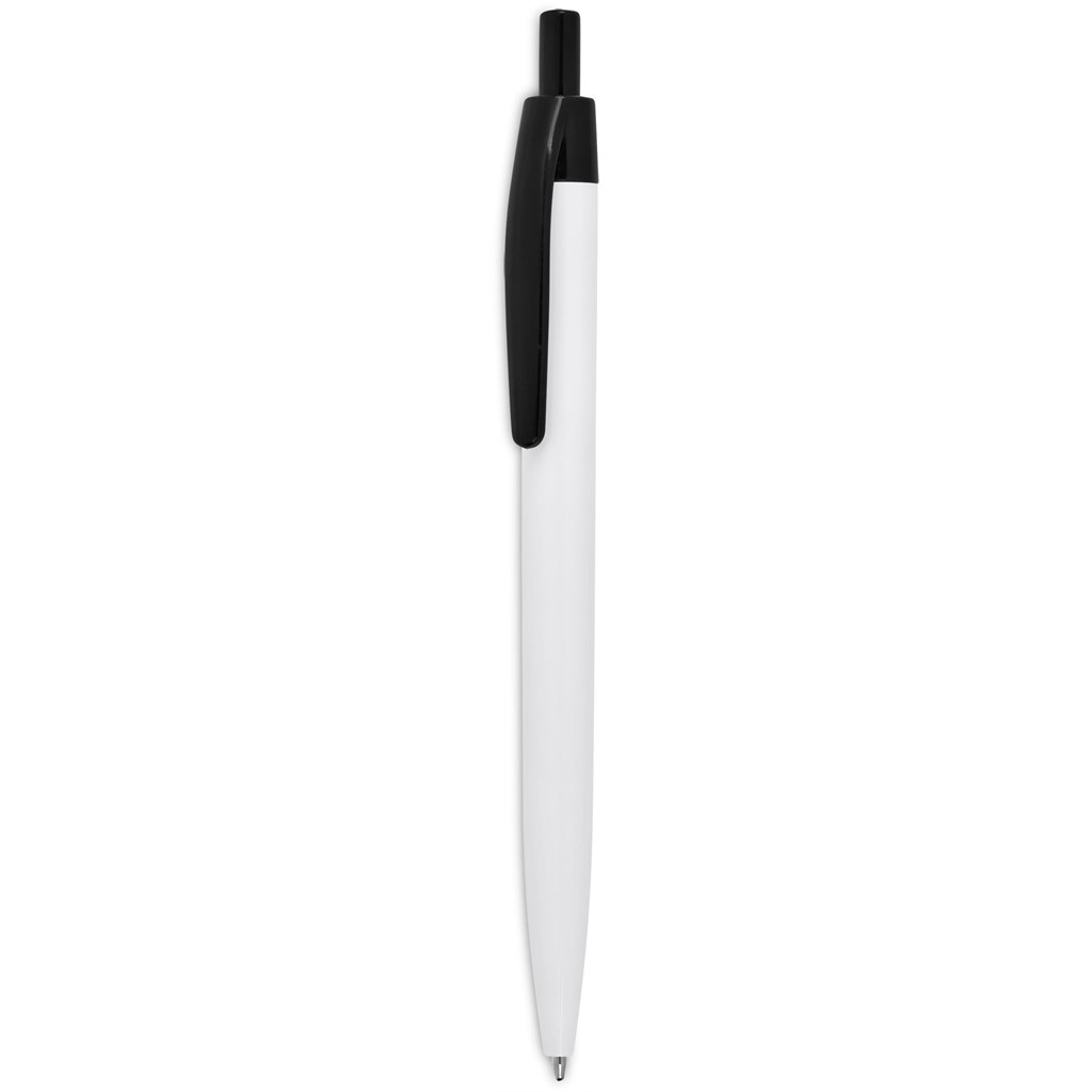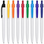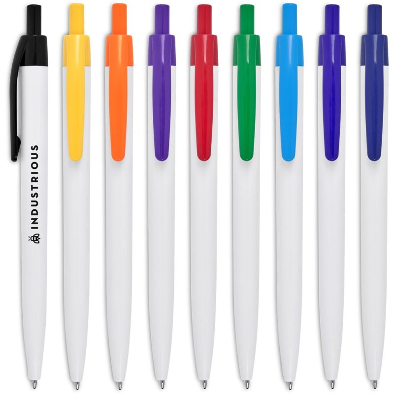 Branding on the white barrel of this economical but reliable ball pen is most effective when matched to the colour of the clip and pusher.