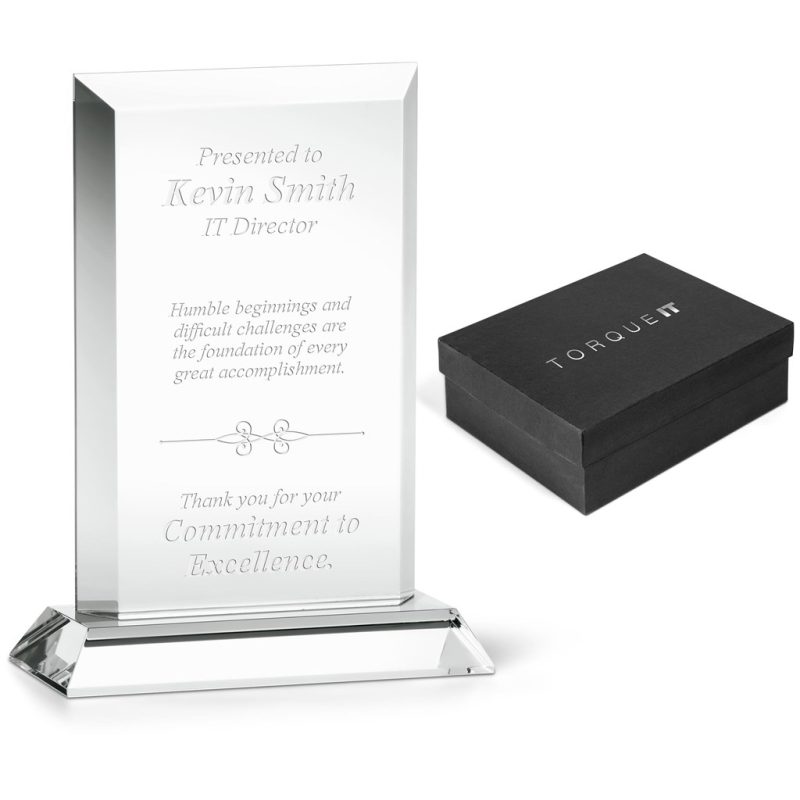 Simple but elegant . Make use of the great branding area . This optical glass award comes in a black presentation box.