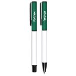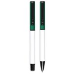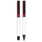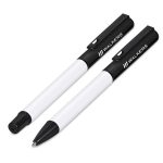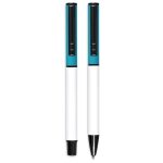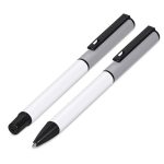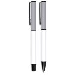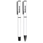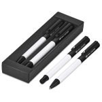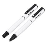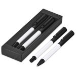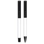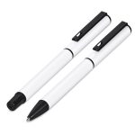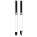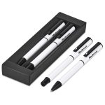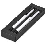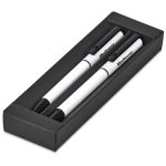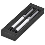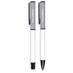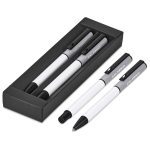 A matching ball pen and rollerball are neatly packaged together in a slider-style paper presentation box. The ball pen has a longer writing distance and is suited to everyday use. The rollerball has a freer flowing ink, leading to a shorter writing distance but smoother writing, making it more suited to signing documents, filling out forms or making short notes. The upper barrel of the ball pen and the lid of the rollerball are designed for standout branding of your logo by pad print or laser.