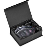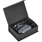 An optical glass award with a prism refraction effect around the edges. Presented in an elegant box with a padded satin lining inner.