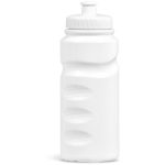 This squeezable plastic water bottle features a white base with a transparent strip, with volume markings to help you keep track of your hydration.