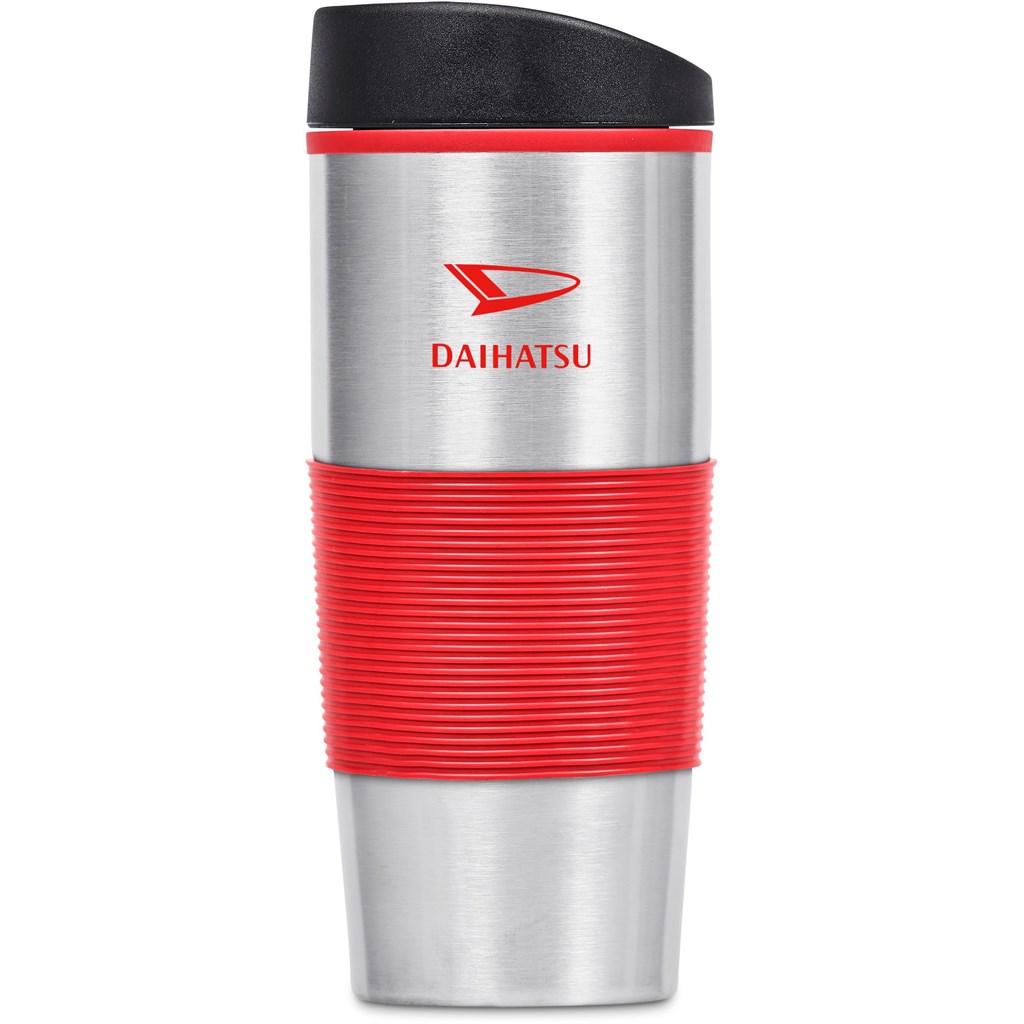 This vibrant tumbler has an eye-catching easy-grip rubber sleeve & matching flip-top spout.